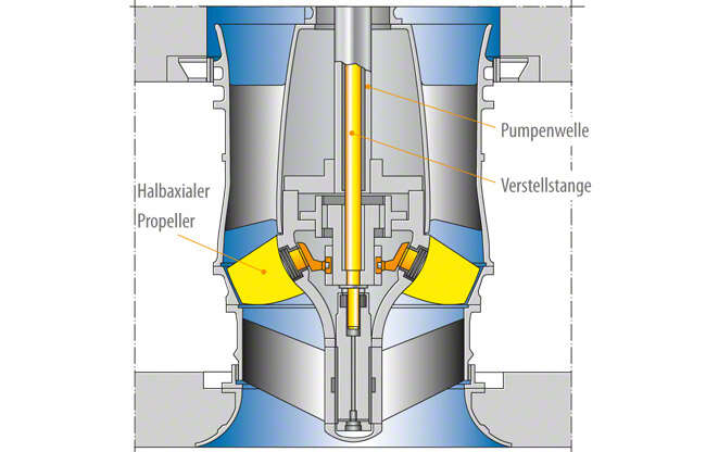Sie ist eine auf Propellerpumpen mit axialen und halbaxialen Laufrädern beschränkte, pumpeninterne Einrichtung, die eine Veränderung der Steigung der Laufschaufeln während des Betriebes gestattet. Dadurch ändern sich bei konstanter Drehzahl der Förderstrom, die Förderhöhe und der Leistungsbedarf. Dies ermöglicht hinsichtlich geringer Verluste eine optimale Regelung. Nachteilig ist der erhebliche konstruktive Aufwand. Die im Kreiselpumpenbau vorherrschende Laufschaufelverstellung ist die durch eine axial verschiebbar gelagerte Verstellstange in einer hohlen Pumpenwelle, die z. B. bei großen Kühlwasserpumpen Verstellkräfte von bis 600 kN und in Sonderfällen noch mehr aufnimmt. Die Verstellstange wird dabei über einen mechanischen Gewindeantrieb oder Hydraulikkolben axial verschoben. siehe Abb. 1 Laufschaufelverstellung
