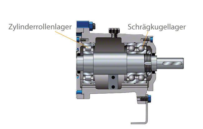 Abb. 4 Wälzlager zeigt eine typische Wellenlagerung einer Niederdruckpumpe mit Zylinderrollen- und Schrägkugellagern. In Radiallagern laufen die Wälzkörper zwischen Ringen (Ringlager) und in Axiallagern zwischen Scheiben (Scheibenlager).