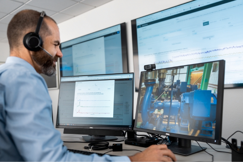 Im KSB SupremeServ Monitoring Center überwachen erfahrene und zertifizierte Experten kontinuierlich die Daten von Pumpen. Wenn auffällige Messwerte festgestellt werden, analysieren die Spezialisten die Ursachen und geben detaillierte Rückschlüsse auf mögliche Anomalien. Dies hilft, potenzielle Probleme frühzeitig zu erkennen und zu beheben, bevor sie zu größeren Störungen führen. Das KSB SupremeServ Monitoring Center bietet somit eine erhöhte Betriebssicherheit, Verfügbarkeit und Effizienz von Anlagen.