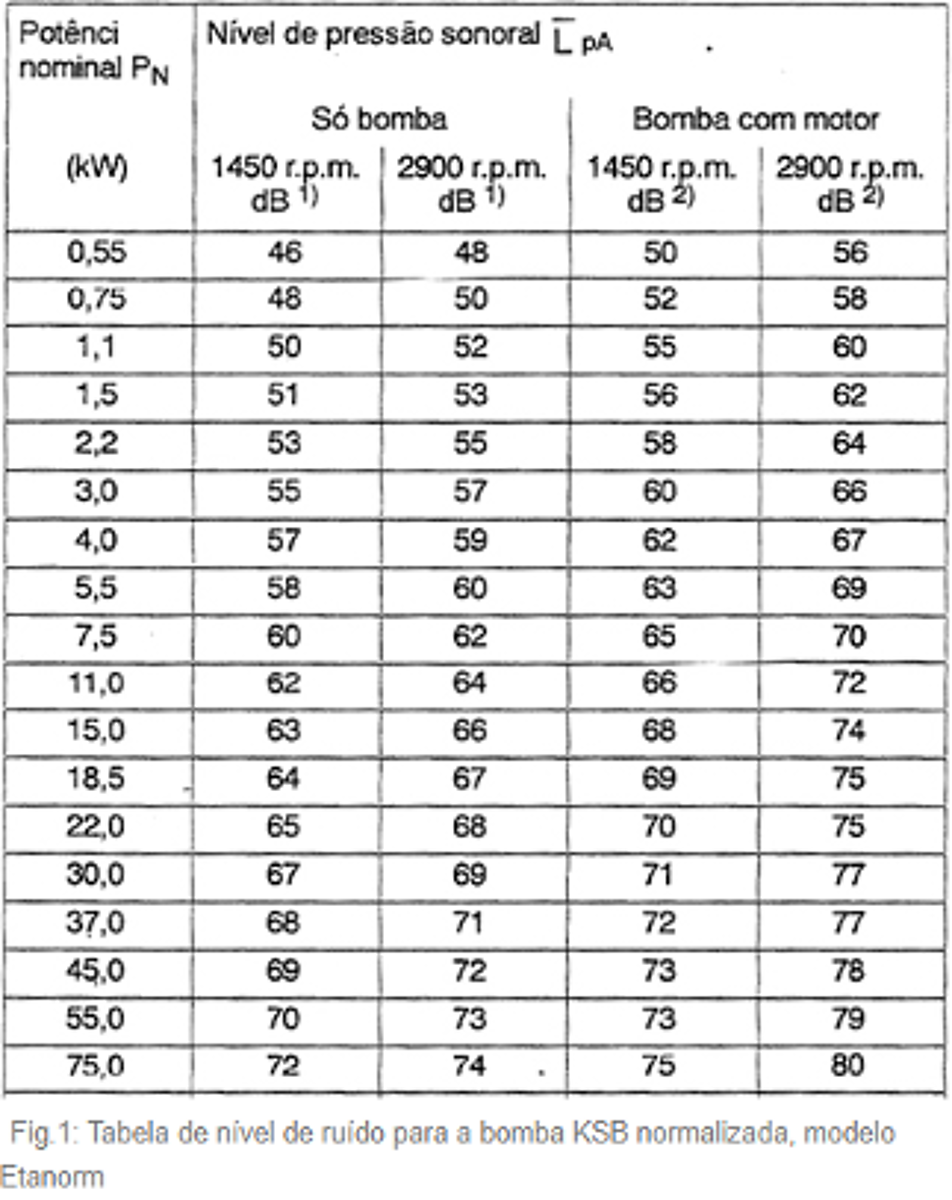 As bombas fabricadas pela KSB já há muitos anos (décadas) que cumprem as mais rigorosas normas de ruído, uma vez que estas já existem desde então na Alemanha (DIN 45 635). Na figura 1 apresentamos exemplos de valores de ruído (nível de pressão sonora superficial, medida em decibéis – dB) para várias potências de motor, quer por influência da bomba sozinha, quer por influência do grupo electrobomba completo, para a nossa bomba normalizada, o modelo ETANORM.