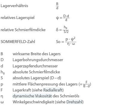 Ziel einer Gleitlagerauslegung ist es, möglichst sicher eine reine Flüssigkeitsreibung beim Betrieb entstehen zu lassen. Der Auslegungsablauf beruht teilweise auf theoretischen und experimentellen Unterlagen, die in geeigneter Weise mehrere Kennzahlen in ihren Zusammenhängen wie bspw. für ein Radial-Gleitlager wiedergeben: siehe Abb. 7 Gleitlager