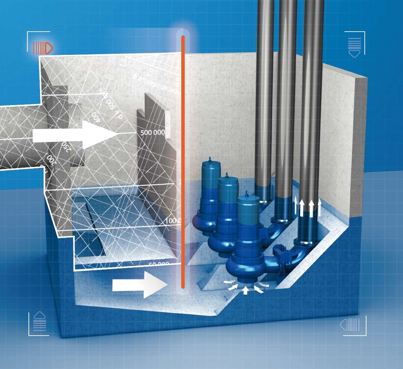 Main or intermediate pumping stations transport domestic, industrial or municipal grey water and sewage as well as stormwater. Apart from dry-installed centrifugal pumps, submersible motor pumps are also frequently employed in such pumping stations. Many system-related requirements have to be met when selecting waste water pumps, whose operation is influenced by the most diverse of factors. Piping layout, solids content and installation type, for instance, are decisive for trouble-free operation.
