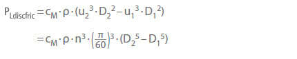 The moment coefficient (cM) takes into account the influences of the Reynolds number, the surface roughness and the side gap geometry. As the equation shows, disc friction changes at constant circumferential speed with the square of the outside diameter of the impeller and at constant rotational speed with the fifth power of the outside diameter of the impeller. If the outside diameter of the impeller and the rotational speed are constant, the ratio of disc friction (PLdiscfric) to power input (P) depends on the flow rate (Q), i.e. this ratio is a function of the specific speed (ns).