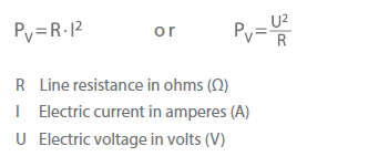 The loss of power when transferring electrical energy depends directly on the line resistance (R) and, consequently, on the line diameter, as well as on the material used and the electric current flowing (I). It can be calculated by dividing the voltage drop by the line resistance R (U):