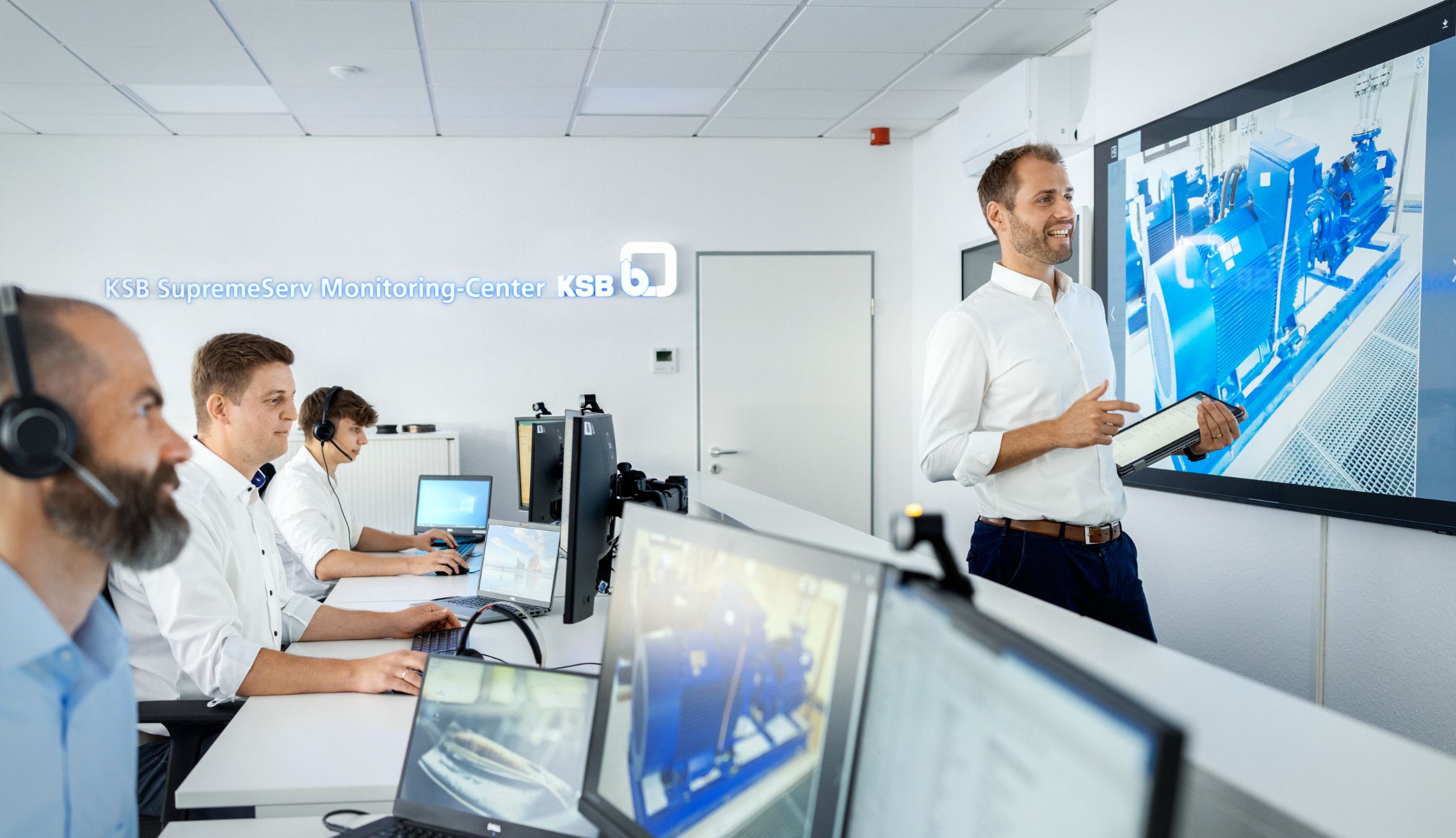 Nicht alle Unternehmen verfügen über erfahrene Diagnoseexperten, welche die übermittelten Daten einer Maschine analysieren und richtig interpretieren können. Für diese Unternehmen gibt es KSB SupremeServ ­Monitoring. „Aus der Ferne überwachen wir heute bereits mehr als 3.000 Pumpen in rund 40 Ländern weltweit“, sagt Lukas Schneider vom KSB SupremeServ Monitoring-Center in Frankenthal. „Dabei nutzen wir neben klassischen Diagnoseverfahren auch künstliche Intelligenz.“ Als Wächter aus der Ferne rückt KSB auf diese Weise noch ein Stückchen näher an seine Kunden.