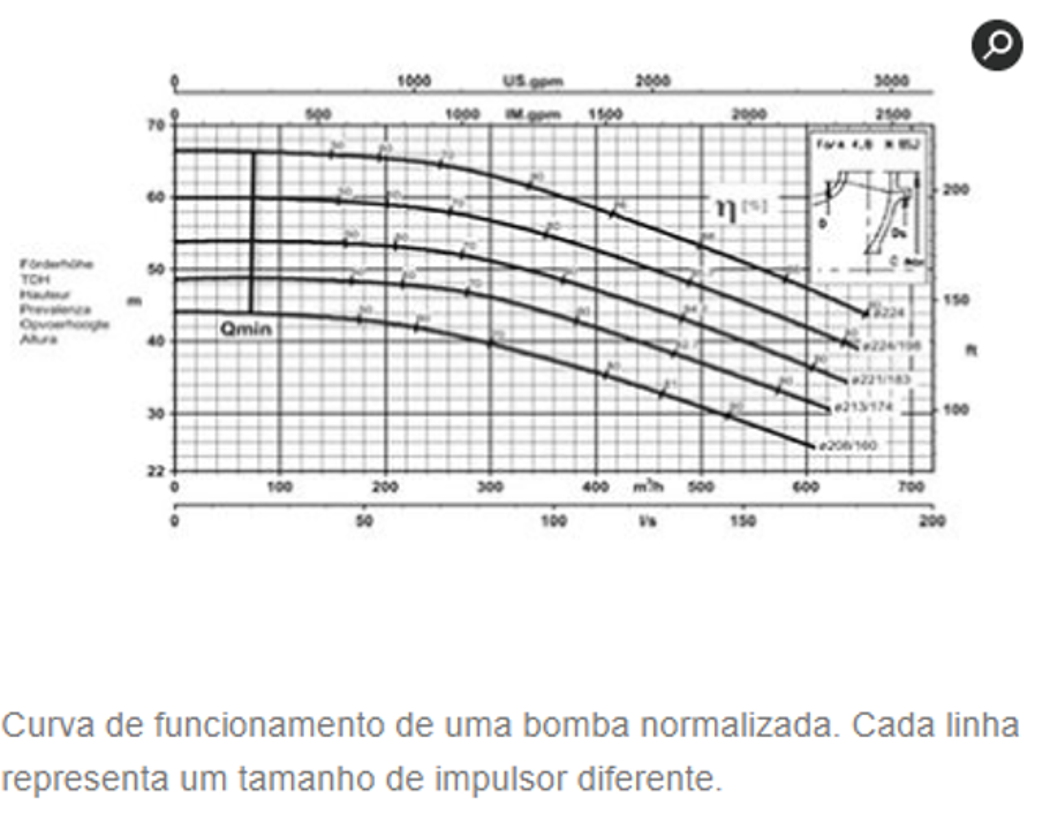 Como pode ser visto na parte superior da figura, que apresenta a curva de funcionamento ou característica da bomba, esta tem limitações quer no que respeita ao caudal mínimo, quer ao caudal máximo (fim da curva), além de ter zonas de maior ou menor rendimento. A melhor opção é sempre escolher uma bomba que funcione nas zonas de maior rendimento, não só por razões de eficiência energética, mas também por razões de fiabilidade e durabilidade.