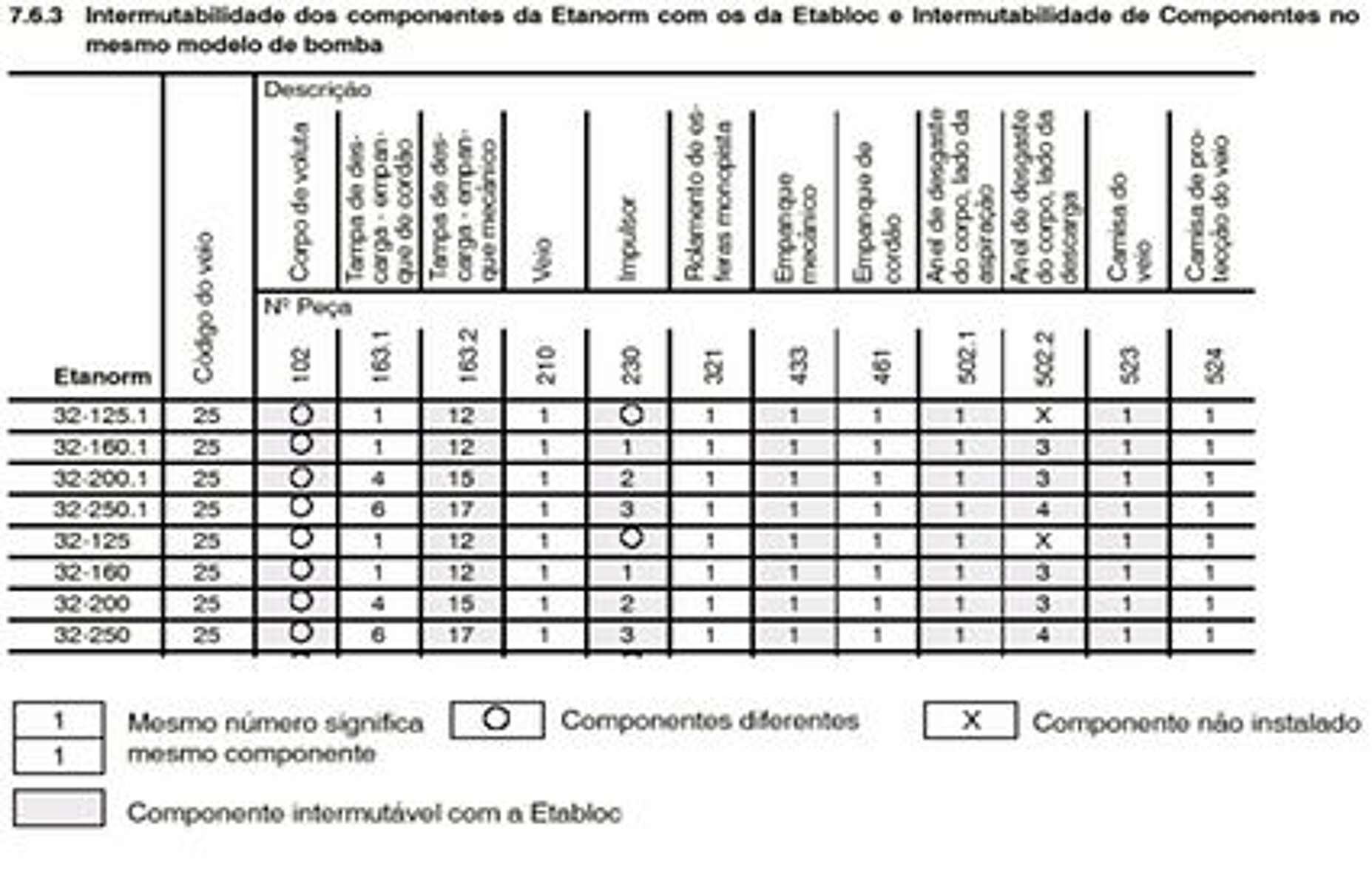 Mas, no caso da KSB, essa intermutabilidade vai mais longe, pois permite nalguns casos usar peças de um modelo noutro modelo diferente. A título de exemplo, apresentamos parte de uma tabela, referente aos modelos Etanorm e Etabloc.