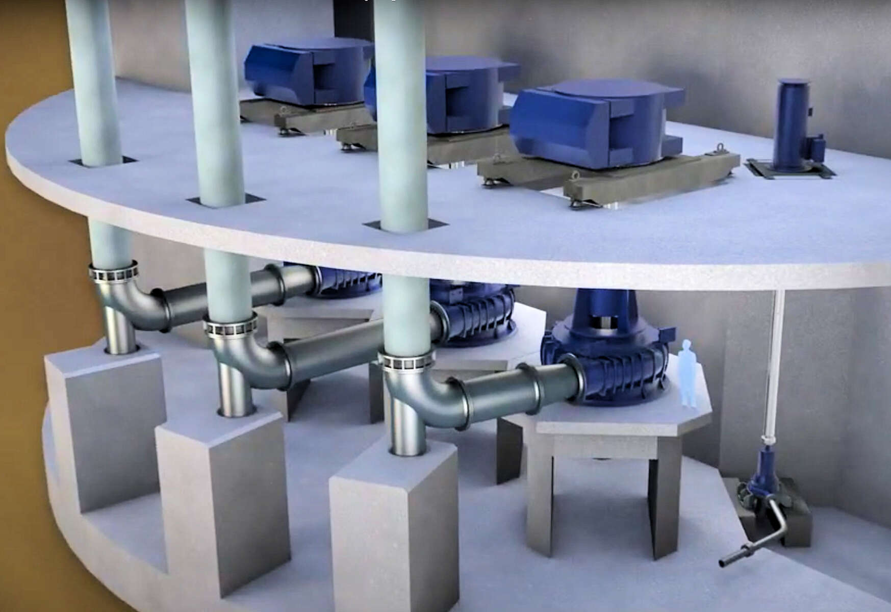 De acordo com João Leite, director geral da KSB em Portugal, “cada uma destas 6 bombas, do modelo Sewatec, pesa mais de 100 toneladas e bombeia mais de 6 m3/s, o que faz delas umas das maiores do mundo”! João Leite informa ainda que “cada veio tem 3 m de comprimento e o impulsor (componente que roda para bombear) tem um diâmetro de 1,8 m e pesa 3 toneladas (ver foto)”!