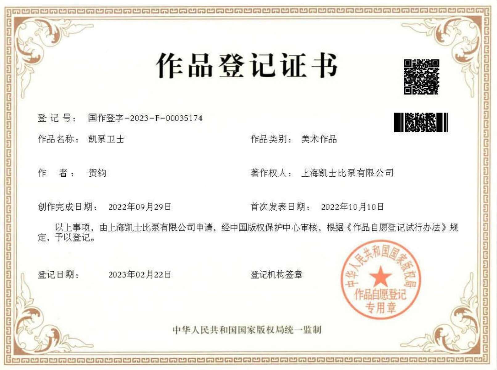2023年2月22日,中国国家版权局正式批准了上海凯士比泵有限公司(“凯士比上海”)申请的“凯泵卫士”美术作品的著作权登记并颁发作品登记证书。这也是凯士比上海历史上首个获国家登记的美术作品。
