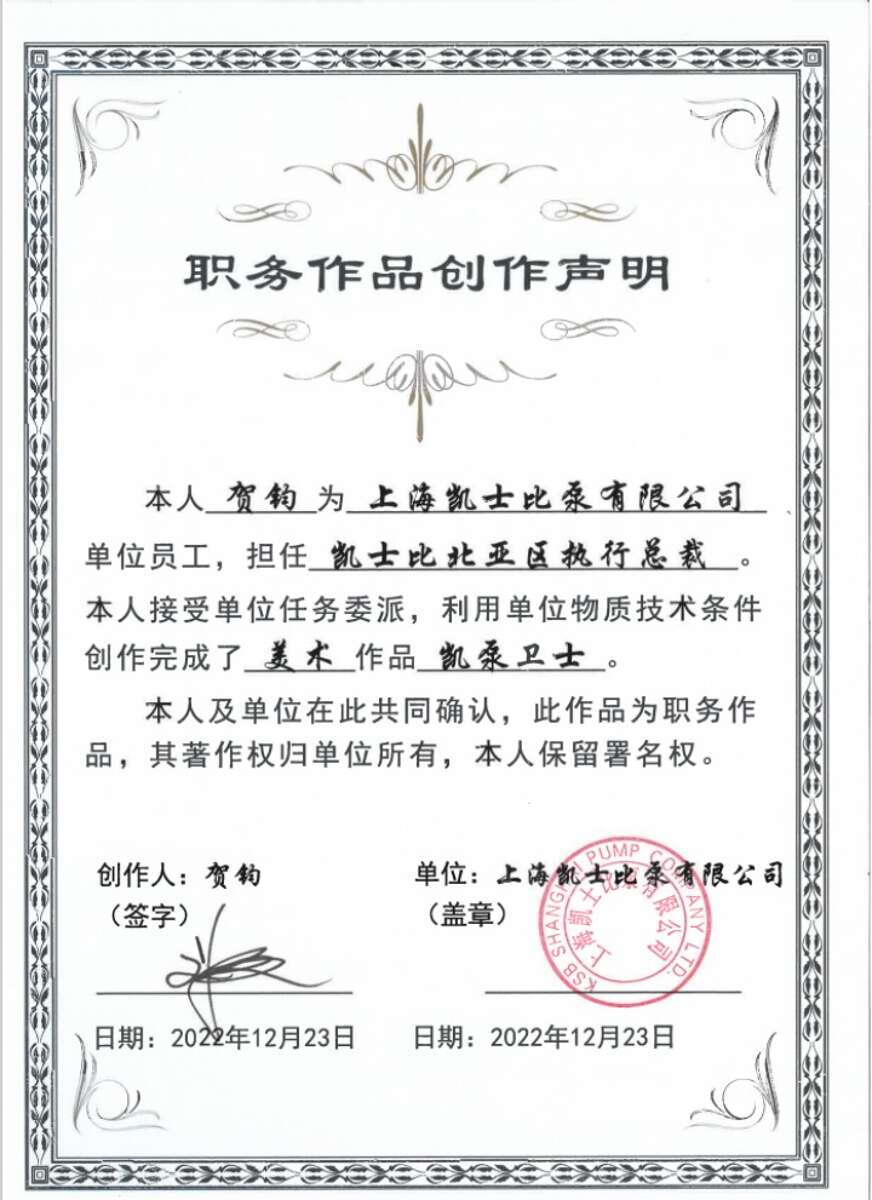 2022年年末的北亚数字化峰会上,“凯泵卫士”美术作品的作者,北亚区域执行总裁贺钧先生签署了《职务作品创作声明》,正式将“凯泵卫士”美术作品的著作权授予凯士比上海,用于后续登记申请。